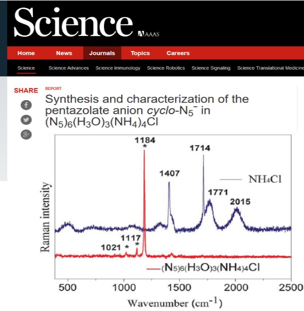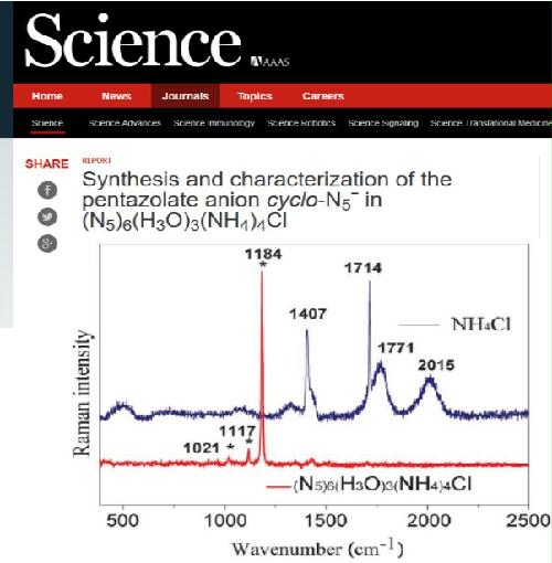 1月27日,国际顶级期刊《Science》在线发表南京理工大学化工学院胡炳成教授团队的研究论文[Synthesis and characterization of the pentazolate anion cyclo-N5ˉ in (N5)6(H3O)3(NH4)4Cl, 2017, 353 (6323), 374-376],该论文报道了一种从芳基五唑制备含全氮阴离子(N5ˉ)化合物的方法,并对化合物的结构进行了解析。文章中化合物结构分析的重要手段之一—拉曼光谱在我中心Renishaw inVia拉曼光谱仪测试获得。