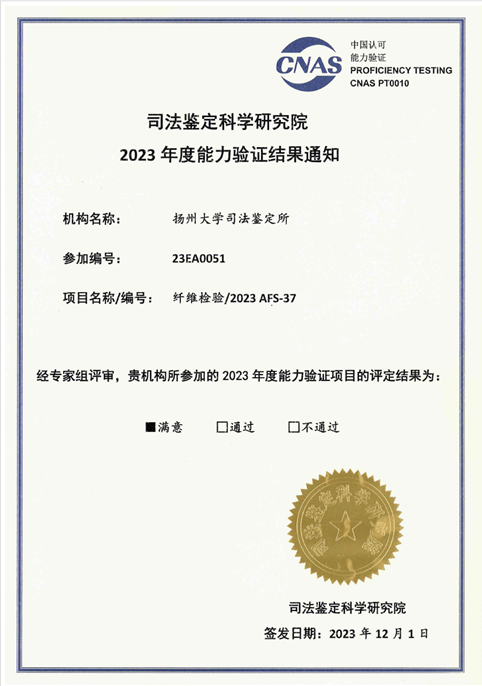 在江苏省司法厅组织开展的2023年度司法鉴定能力验证活动中,扬州大学司法鉴定所组织参加的“纤维鉴定”项目获满意评价。